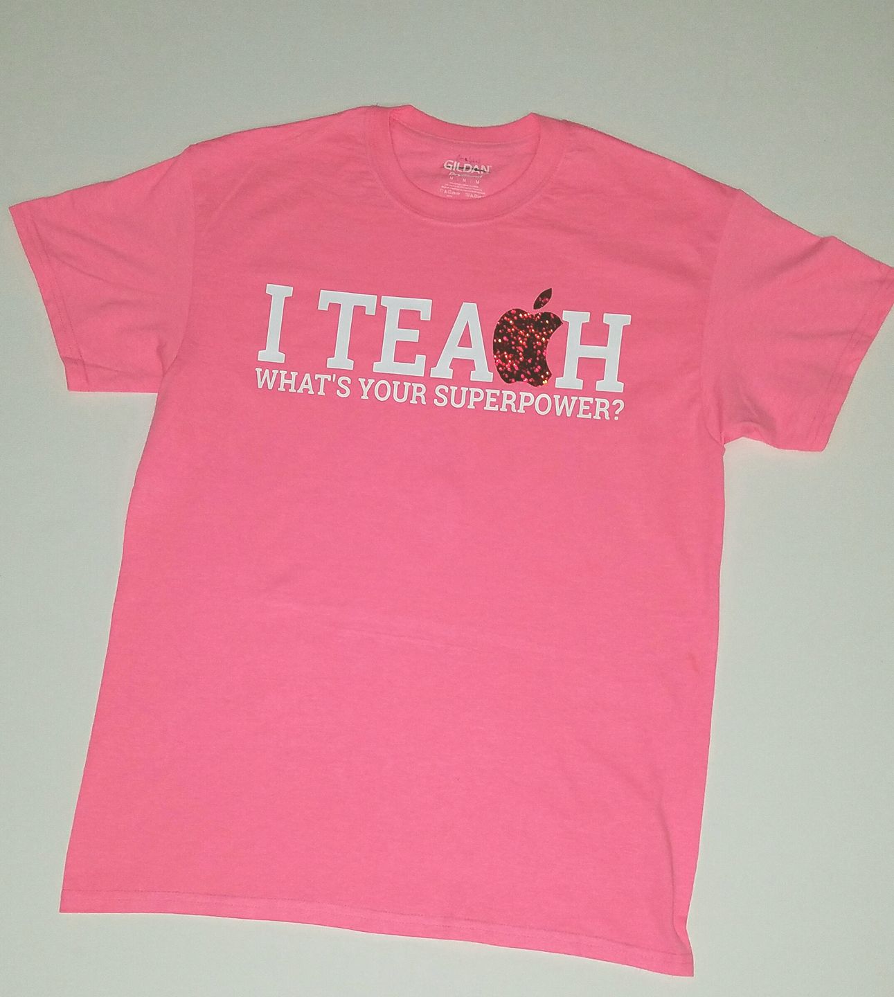 I TEACH...WHAT'S YOUR SUPERPOWER? Pink shirt w/ white and pink hologram print